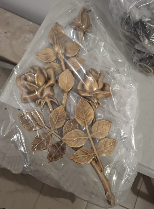Гілка троянди з двома квітами та двома бутонами виконана з бронзового сплаву у вигляді накладного барельєфу.